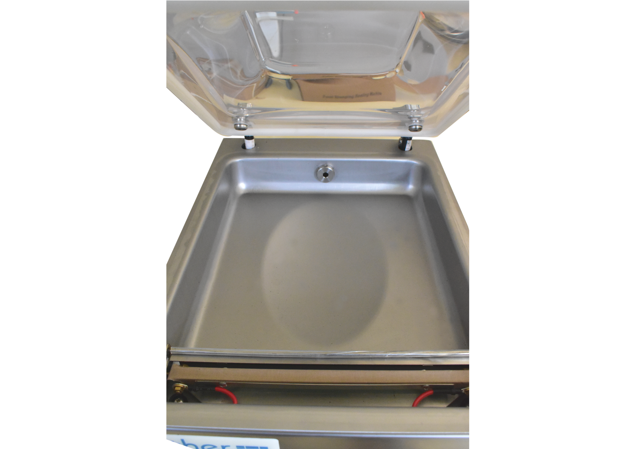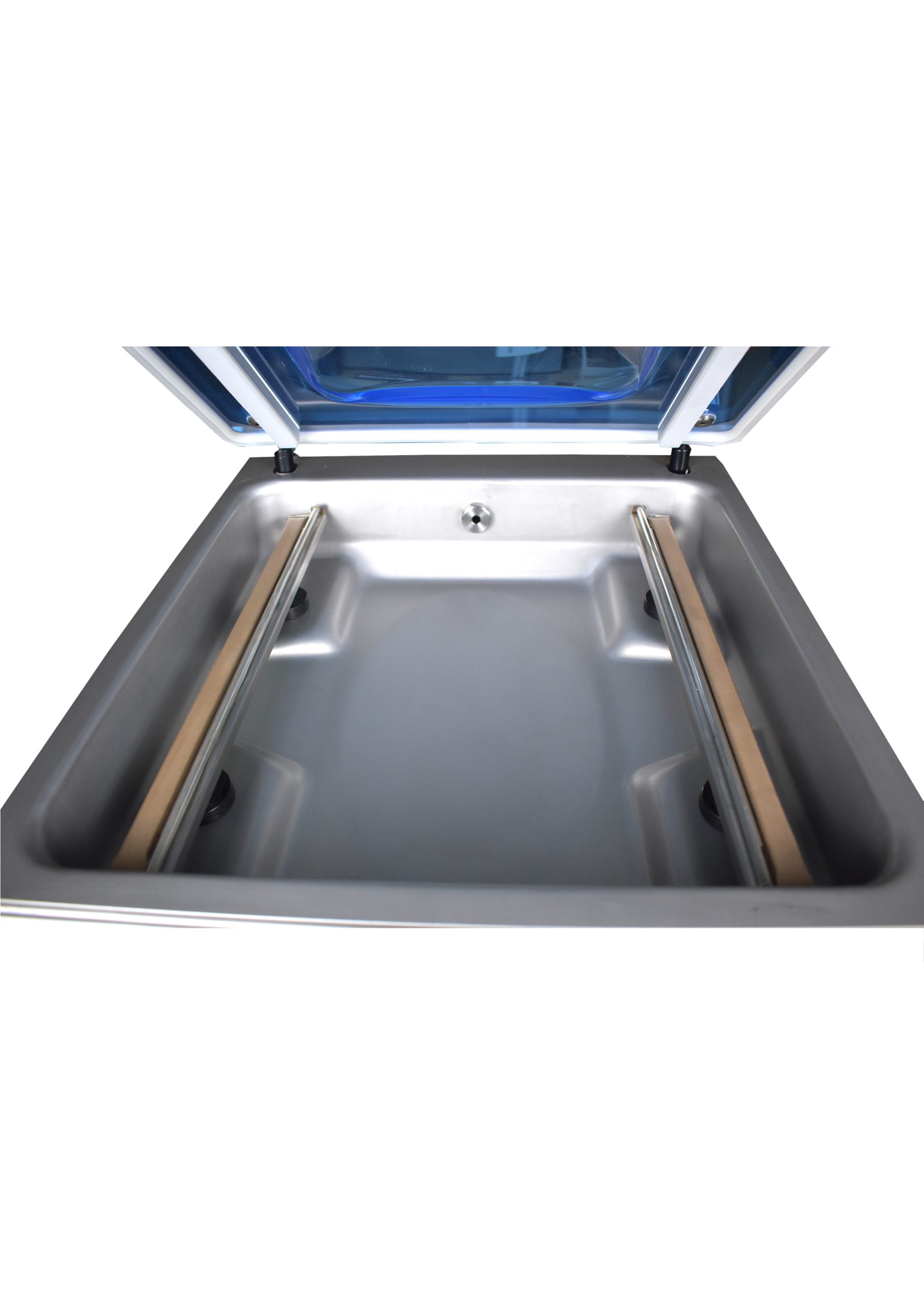 What is the width of the bag opening or mouth? The single sealing bar is 260 mm wide. The bag mouth must not exceed this width to ensure proper sealing. For products with wider openings, diagonal bag placement in the chamber may be possible if it fits within the chamber dimensions.