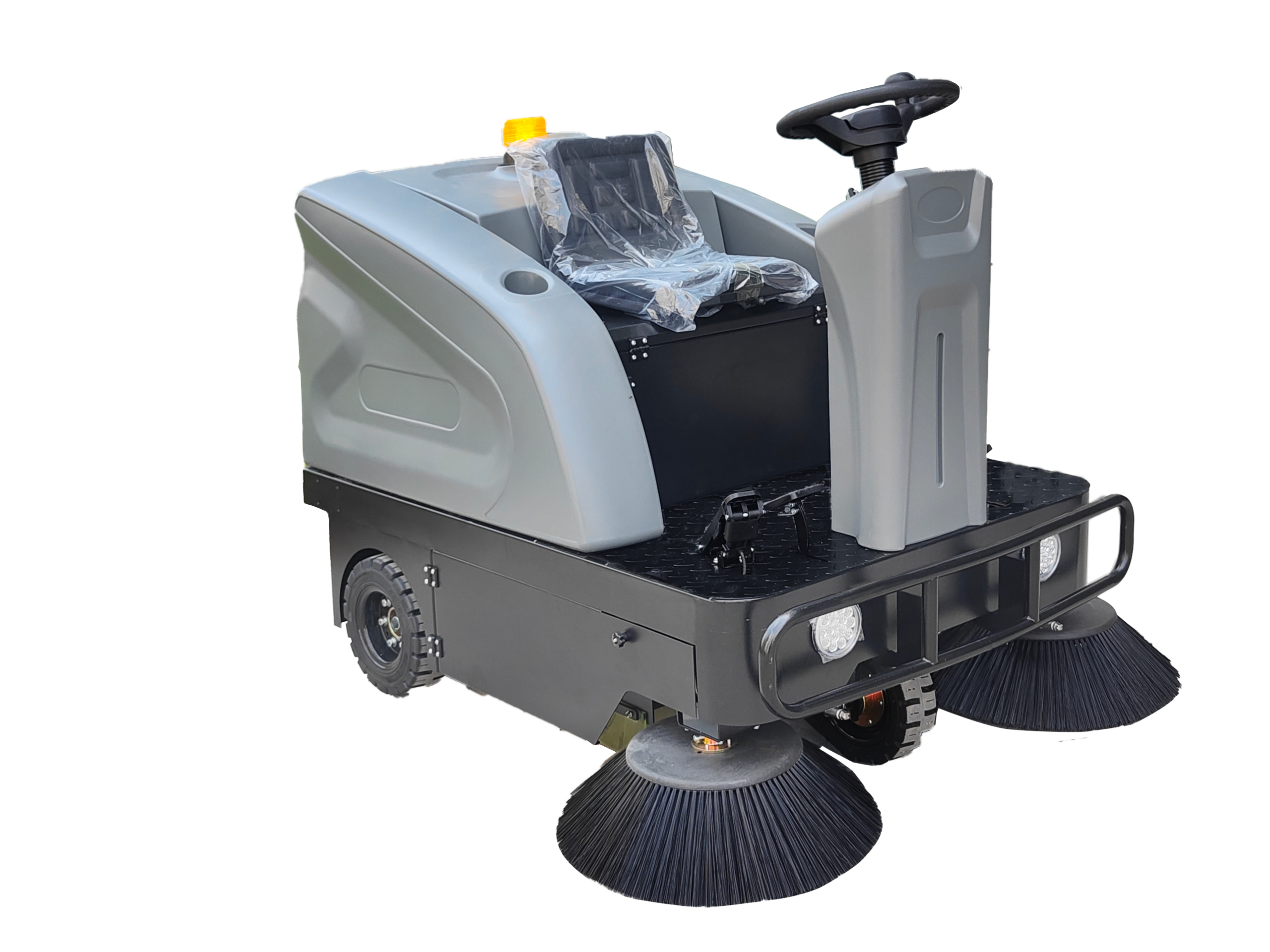 The Ride-on Sweeper SMITH JB1350 stands out for its exceptional cleaning performance, with a cleaning efficiency of 8000㎡/h, making it a top choice for industrial and commercial cleaning needs. This high efficiency ensures that large spaces such as warehouses, parking lots, and factory floors are cleaned swiftly and thoroughly. Equipped with a powerful 48V/2200W power unit and a robust 1200W driving motor, the SMITH JB1350 can tackle heavy-duty tasks effortlessly. Its 1350mm sweeping width, complemented by dual 500mm side brushes, ensures comprehensive cleaning, covering every inch of the cleaning area. Whether dealing with stubborn debris or fine dust, this sweeper’s advanced suction and rolling brush system, powered by a 700W rolling brush motor, guarantees excellent results, even in demanding environments.